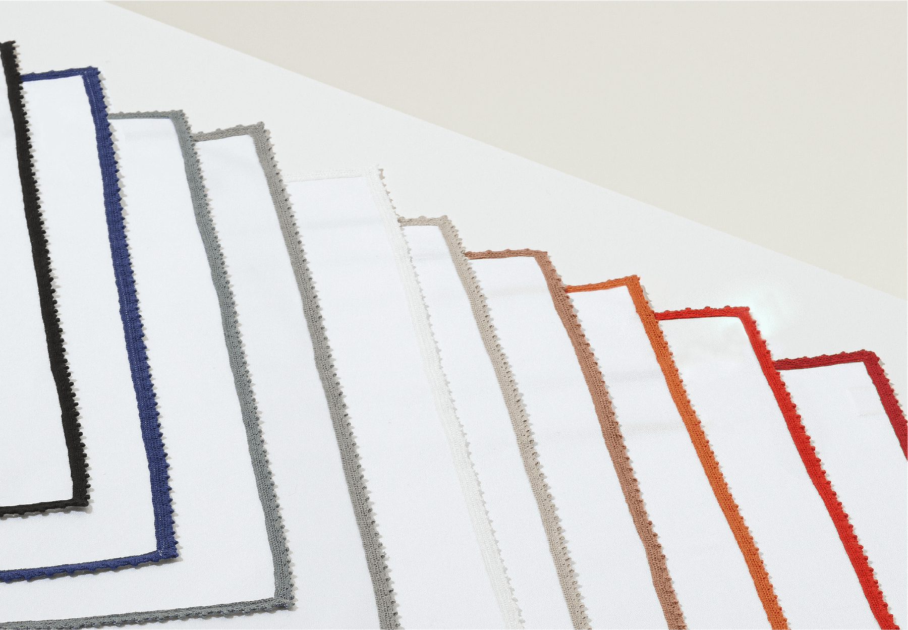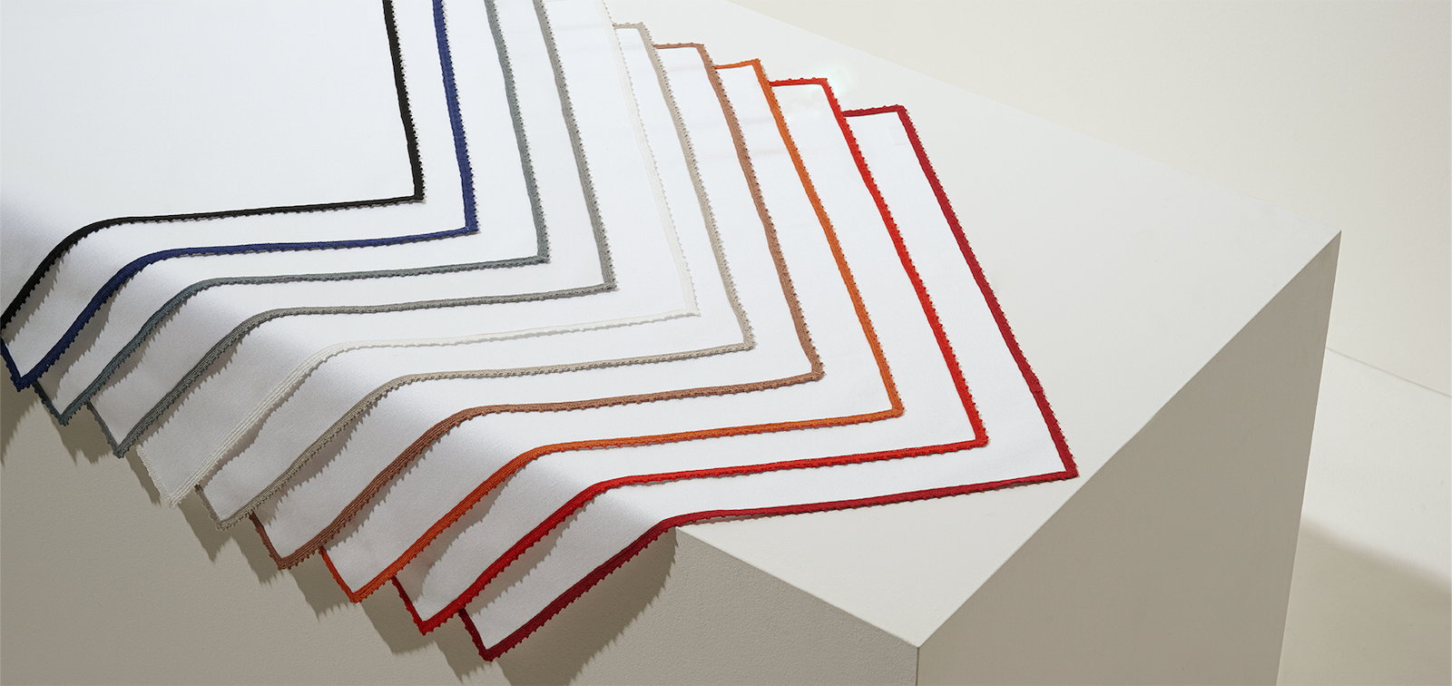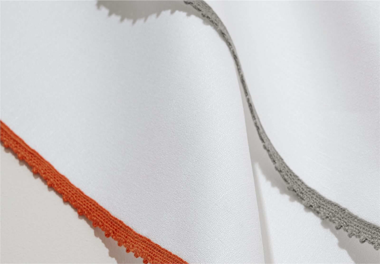 Material, textured, Claire is a refined full-bodied linen and cotton weave, it is the variation of a classic theme finished with a small contrasting lace that give it an essential and refined style. Tablecloth and placemat finished with lace trim, matching napkin.